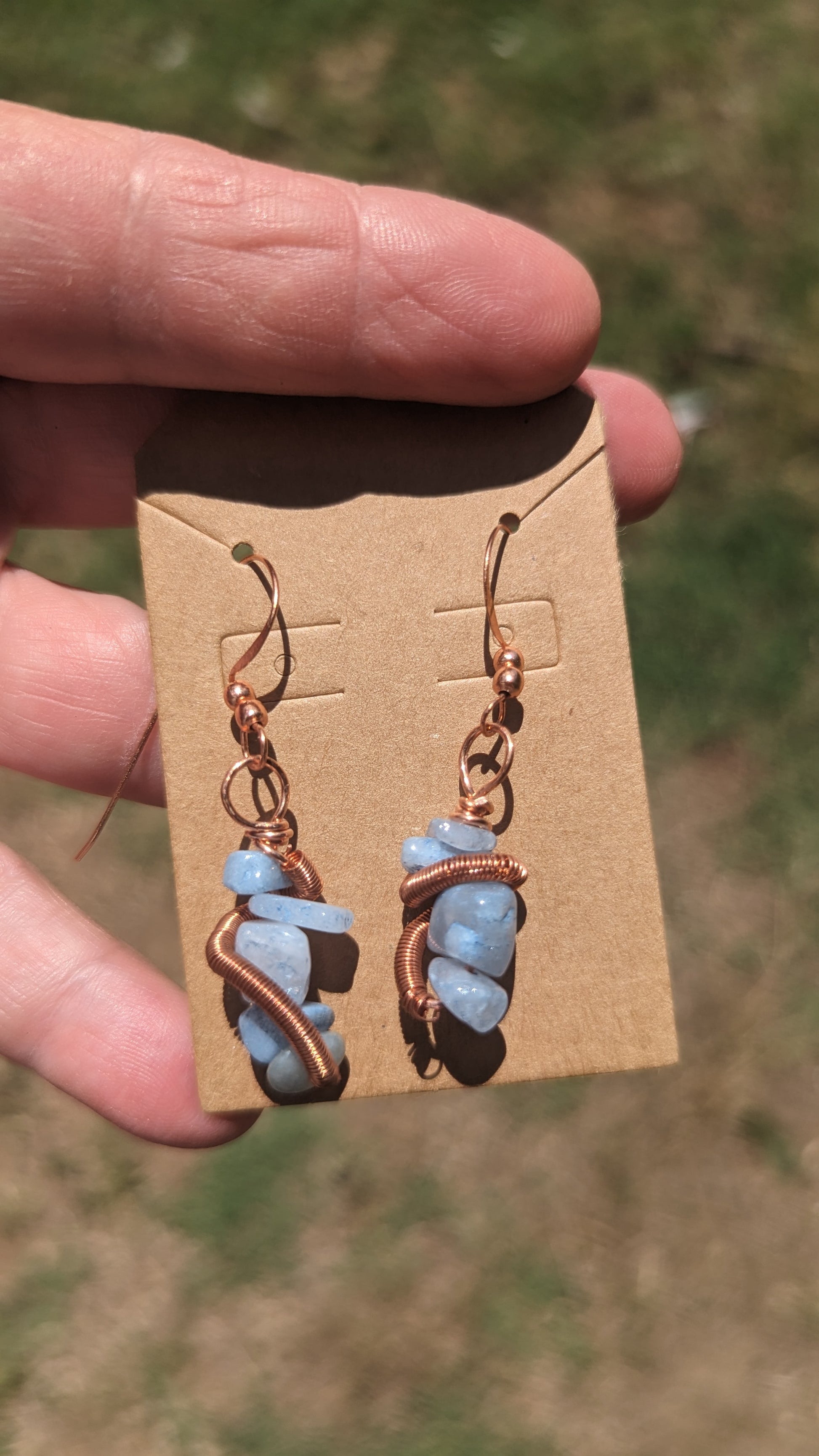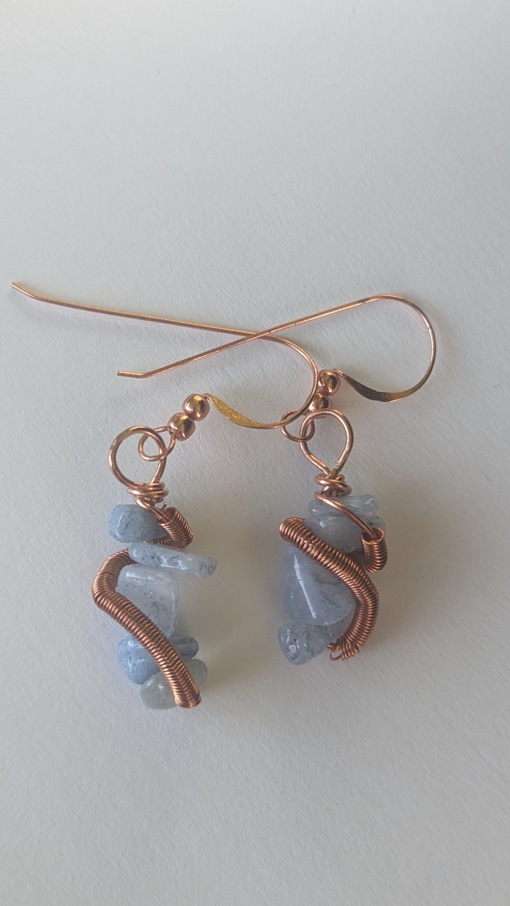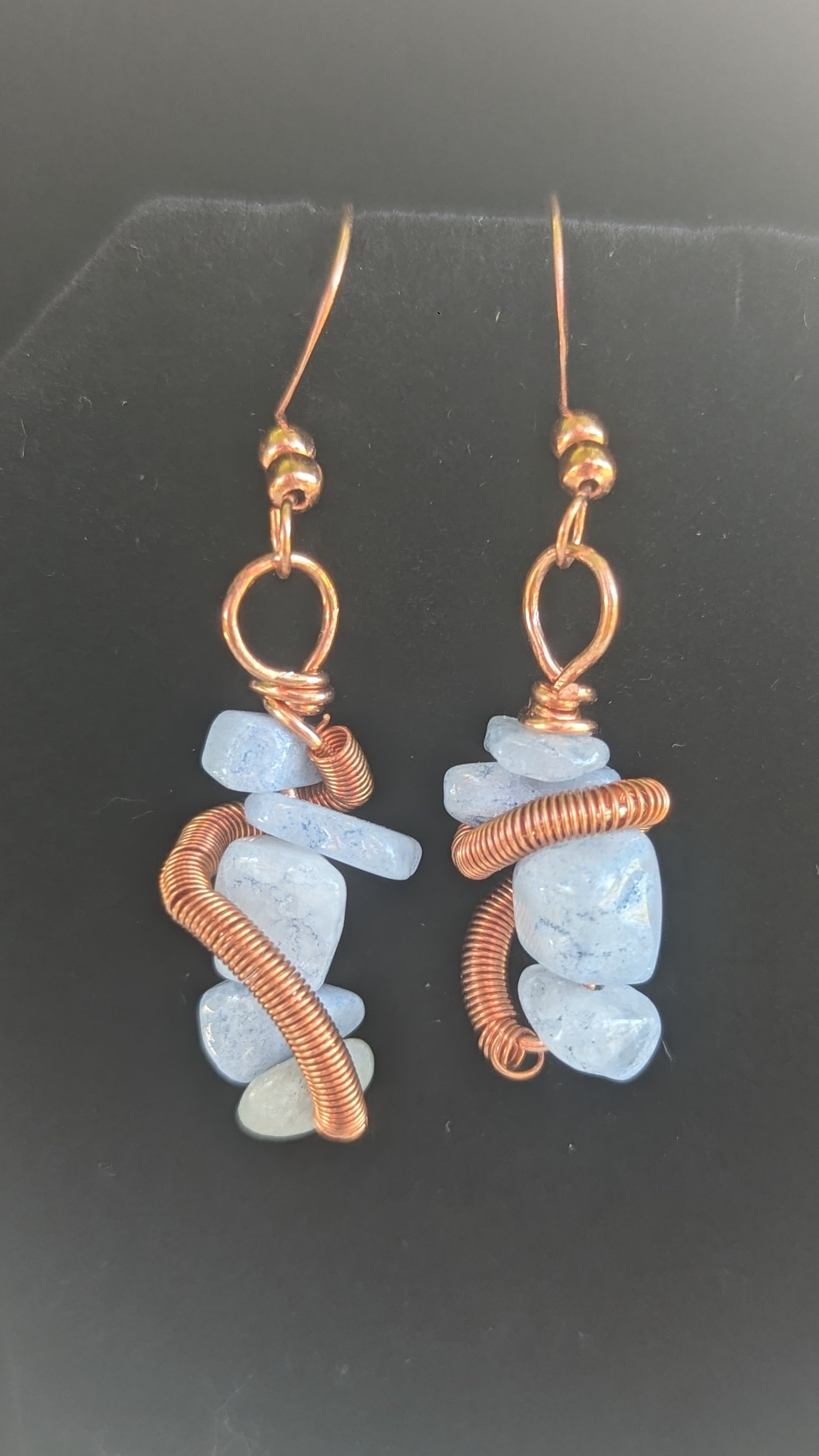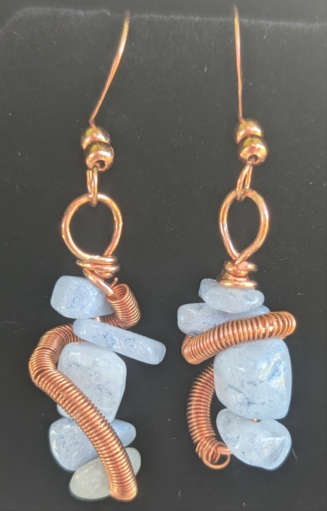 Natural Aquamarine chip stones wrapped with a copper coil, wrapped in copper, hanging on sealed copper ear wires. Measuring about 1 and 3/4 inches.